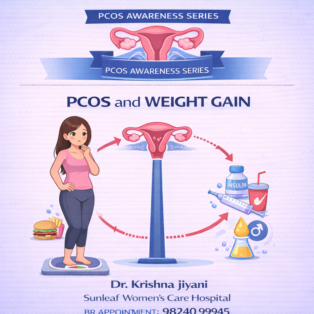 Many women with PCOS (Polycystic Ovary Syndrome) struggle with weight gain, especially around the abdomen. This is not due to lack of effort or willpower—it is related to hormonal and metabolic changes in the body. Understanding this connection helps women manage PCOS more effectively and without guilt. When to Consult a Gynecologist Rapid or unexplained weight gain Difficulty losing weight despite effort Irregular periods with obesity Planning pregnancy with PCOS Early medical support improves long-term health outcomes. #PCOSAWARENESS #PCOSANDWEIGHT #HORMONALHEALTH #WOMENSHEALTH #INSULINRESISTANCE #SUNLEAFWOMENSCAREHOSPITAL #DRMUKESHDOBARIYA #DRKRISHNAJIYANI