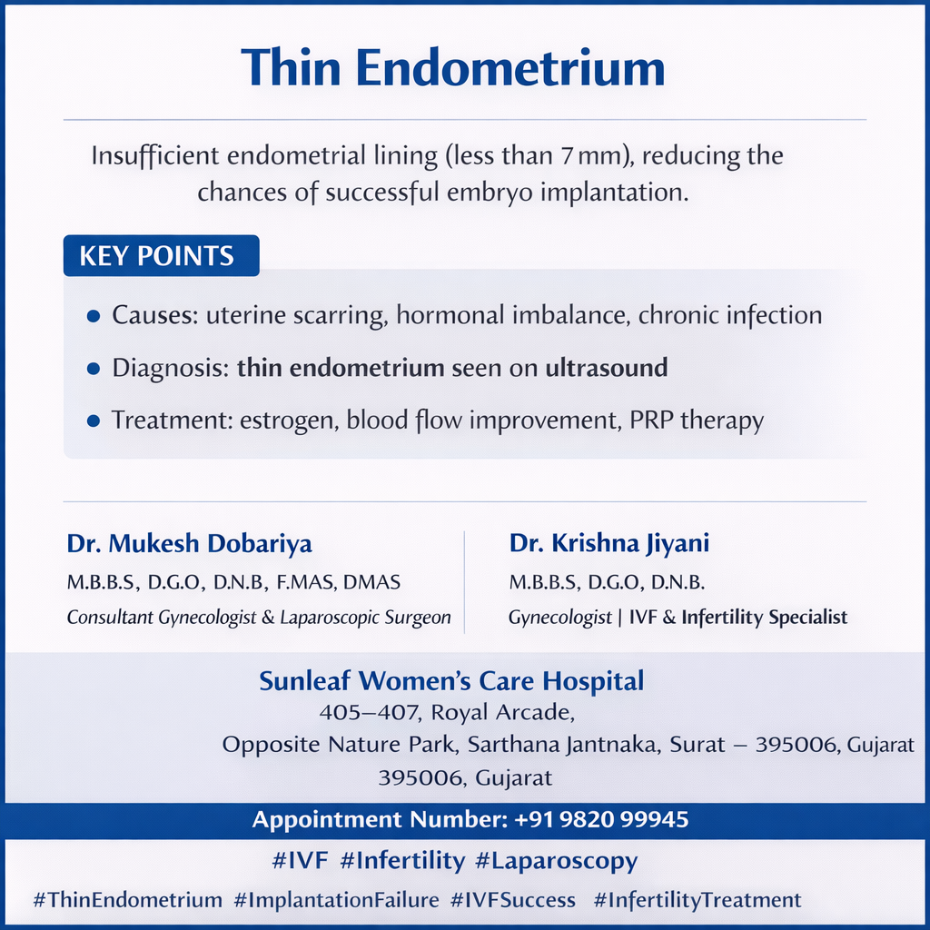 Thin endometrium is a clinically significant condition in infertility practice characterized by inadequate endometrial thickness (<7 mm) during the peri-ovulatory phase, which negatively affects embryo implantation and pregnancy outcomes. A receptive endometrium is essential for successful implantation, and optimal thickness is generally considered to be 7–12 mm with a trilaminar pattern on ultrasound. Thin endometrium may result from chronic endometritis, previous uterine curettage (Asherman’s syndrome), genital tuberculosis, poor uterine blood flow, hormonal insufficiency, or prolonged use of anti-estrogen drugs like clomiphene citrate. Clinically, patients often present with infertility, repeated implantation failure in IVF cycles, or history of scanty menstrual flow. Diagnosis is made by transvaginal ultrasound, which shows reduced endometrial thickness and sometimes poor vascularity on Doppler studies. Management is often challenging and requires a multimodal approach, including estrogen supplementation, improving uterine blood flow (aspirin, sildenafil), use of granulocyte colony-stimulating factor (G-CSF), platelet-rich plasma (PRP) therapy, and treatment of underlying infections such as tuberculosis or endometritis. In assisted reproductive techniques, optimizing endometrial receptivity is crucial, and strategies such as freeze-all cycles with later embryo transfer after endometrial preparation may be employed. Early identification and targeted management can significantly improve implantation rates and IVF success outcomes. KEY MESSAGE Adequate endometrial thickness is essential for implantation; thin endometrium requires targeted treatment to improve fertility outcomes. #ThinEndometrium #ImplantationFailure #IVFSuccess #InfertilityTreatment #EndometrialReceptivity #GynecologyEducation #SunleafWomensCareHospital #DrMukeshDobariya #DrKrishnaJiyani #SuratGynecologist #GynecologyUpdate #DailyGynecologyUpdate #WomenHealthSurat #BestDoctor #BestDoctorInVarachha #BestDoctorInSarthana #BestDoctorInGujarat #BestDoctorInIndia #GynecologistInSurat #GoodGynecologistInSurat #GynecNearMe #IVF #IVFTreatment #IVFSuccess #InfertilitySpecialist #FertilityCare #Laparoscopy #LaparoscopicSurgery #MinimallyInvasiveSurgery #FertilityExpert
