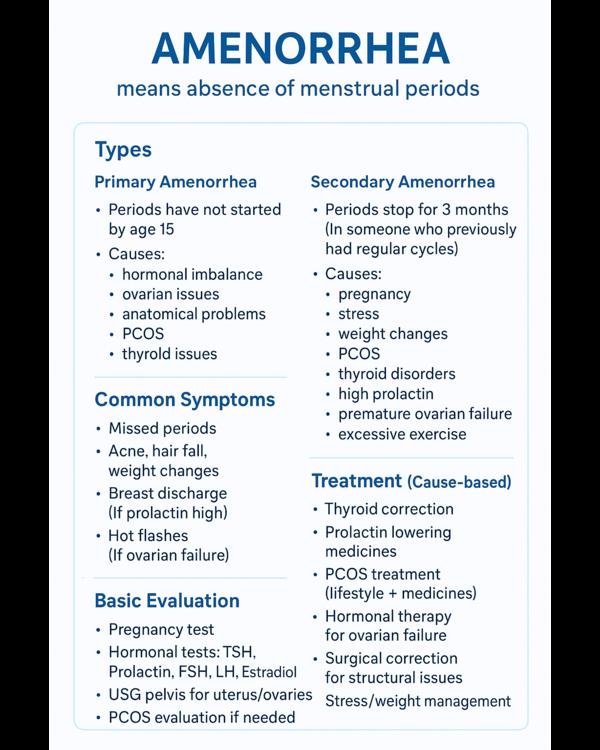 Amenorrhea means absence of menstrual periods.