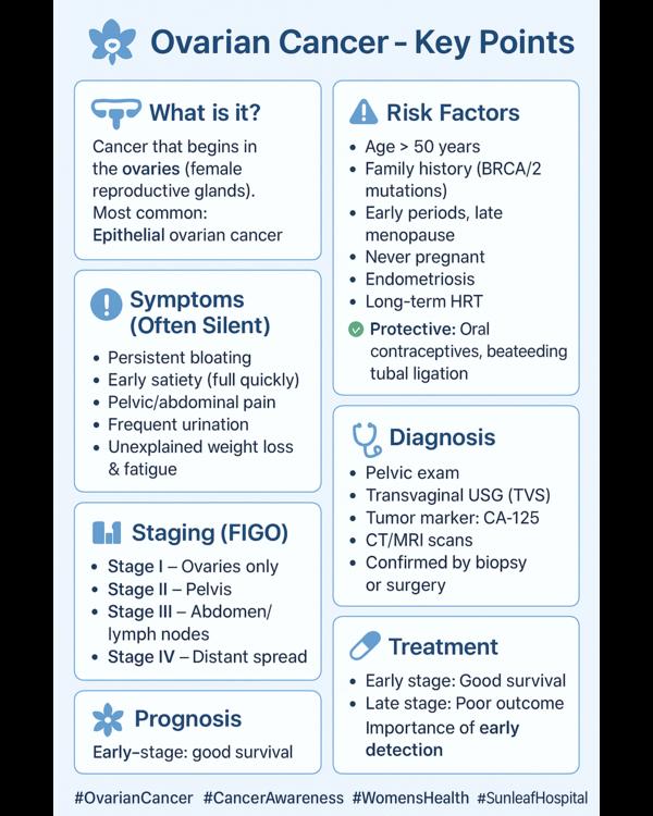 Cancer that begins in the ovaries (female reproductive glands). Most common: Epithelial ovarian canc